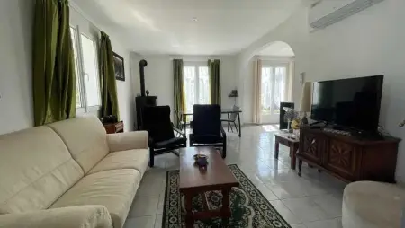 L'intérieur de la maison est à la fois spacieux et lumineux, offrant un environnement confortable et accueillant. Le salon comprend deux fauteuils agréables et une télévision à écran plat pour des soirées divertissantes. La cuisine est aménagée avec un îlot central et dispose de tout le nécessaire pour préparer de délicieux repas en famille ou entre amis.